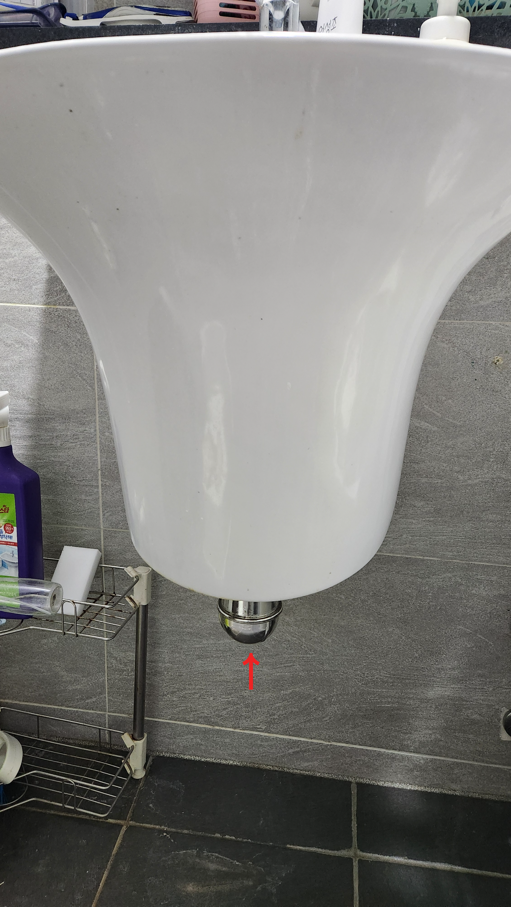 내부 고무패킹이 헐거워진 세면대 배수관이 축 처져 내려와 있습니다.