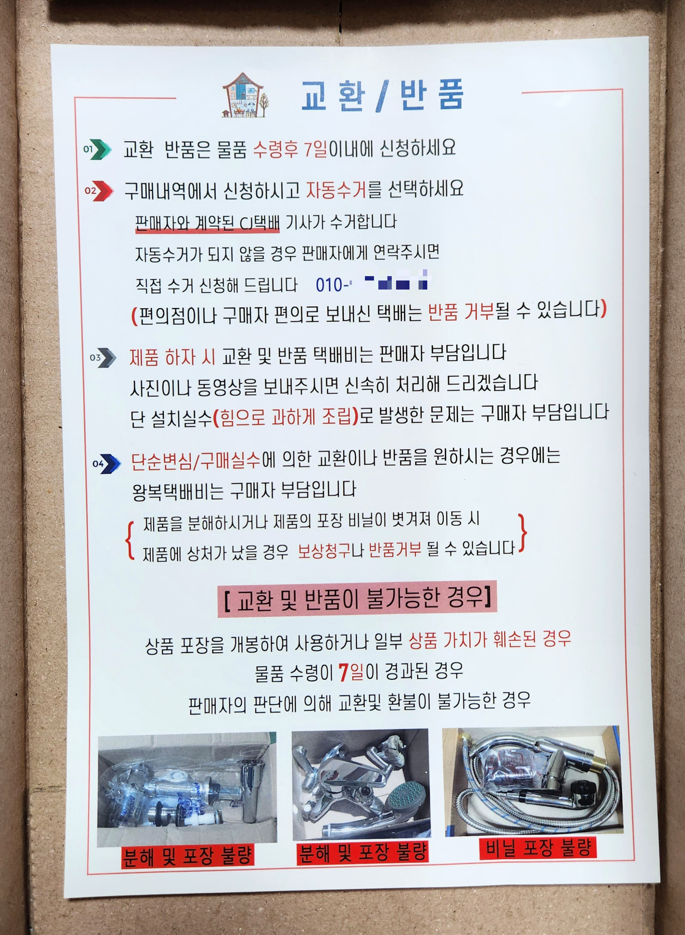 주문한 지 단 하루만에 도착한 세면대 부속품(세면대 배수관 및 팝업), 교환/반품에 대한 안내문.